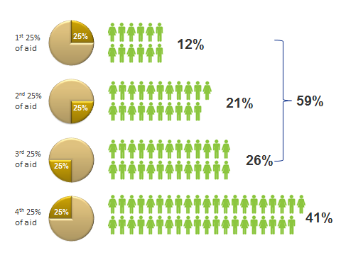While every institution will have a different “ideal” distribution of aid, consider these examples of awarding ratios. If 50 percent of your students are receiving 75 percent of your institutional aid, that means that the other 50 percent of your students are receiving the remaining 25 percent of your aid. In this case, there may be ways to use your aid more effectively because there may be large numbers of non-enrolled students who are not being reached by your current aid program. Likewise, if 70 percent of your students are receiving 75 percent of your aid, your aid program may not be discriminating enough and there may well be groups of students who are not being reached.