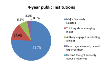 As the above charts show, these students are either thinking about switching majors, are actively selecting a major for the first time, or haven’t gotten serious enough yet to begin exploring majors or even to give the selection of a major much thought.