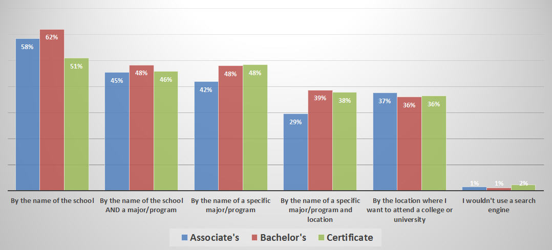- More than four in five respondents seeking certificates, associate’s, and bachelor’s degrees use search engines like Google, Yahoo, and Bing when finding college websites.