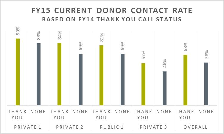 We analyzed data from four of our on-campus managed phonathon programs that conducted thank you calls in FY14 and tracked the results for all constituents that received a thank you call versus those that did not. We specifically looked at those loaded in current donor (aka lybunt) segments the following year.