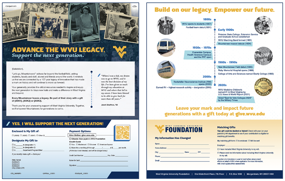 Donors have been clear: Knowing how their generosity makes an impact increases their likelihood to continue investing in an institution. That’s exactly what these pieces did for West Virginia University’s donors. Through a mix of visually appealing quotes, facts and links to video stories, the WVU community saw how important their contribution is—and as a token of gratitude and an investment in retention, they received a window cling acknowledging their donor status for that year, which RNL has created with WVU annually since 2020.