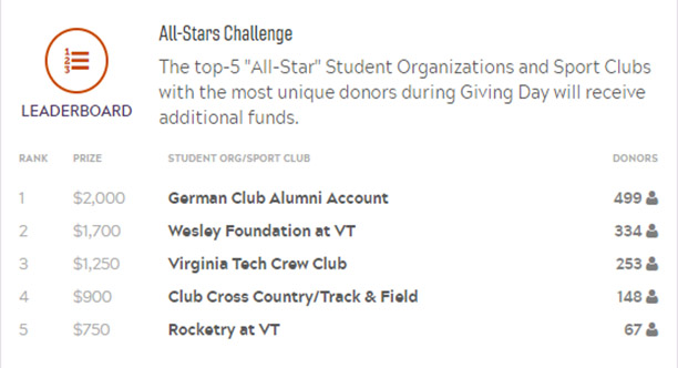 Virginia Tech’s Student Organization All-Star Challenge on Giving Day.