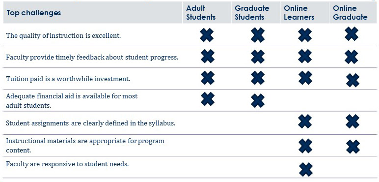 The survey instruments from RNL ask students to indicate both a level of importance and a level of satisfaction that they assign to each educational experience. This combination identifies areas of strength (high importance and high satisfaction) as well as areas of challenge (high importance and low satisfaction). The strengths are areas for the institution to celebrate and to use to recruit and attract new students to the institution. The challenges are the priorities for improvement that need to be a core component of any student success efforts to better retain students at the institution. This chart reflects the top challenges that overlap across adult and graduate populations along with online learners and online graduate students, as identified in the 2021 national data sets:
